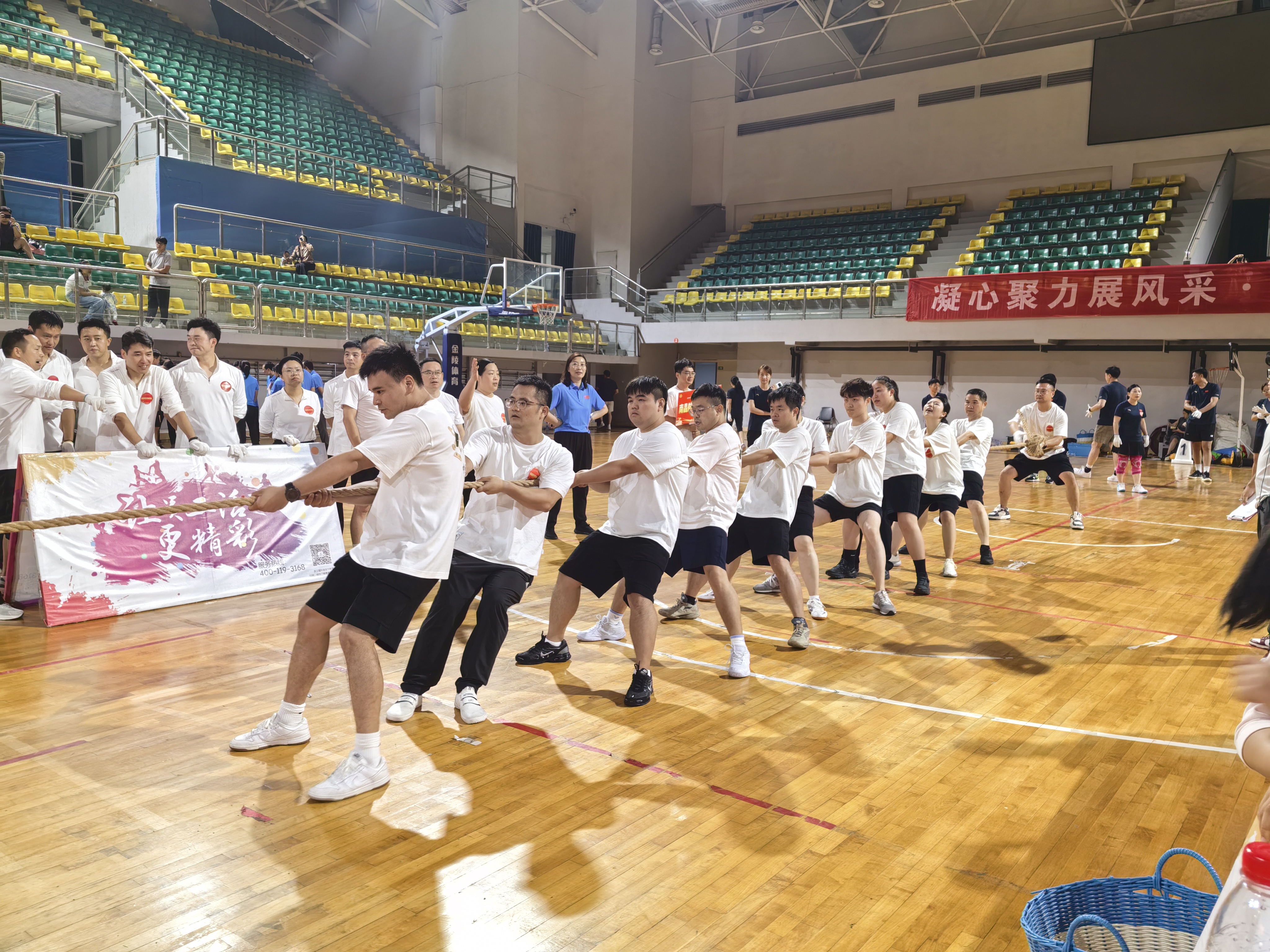 活动设置有“龙行天下”“共筑梦想”“力拔山河”“雷霆战鼓”和“呼啦圈接力”等五个集体项目,集竞技性、趣味性、团队性于一体。比赛在欢快有序的热身活动中拉开序幕,我校职工在赛场上全情投入、团结合作,展现了良好的竞技水平和精神风貌。